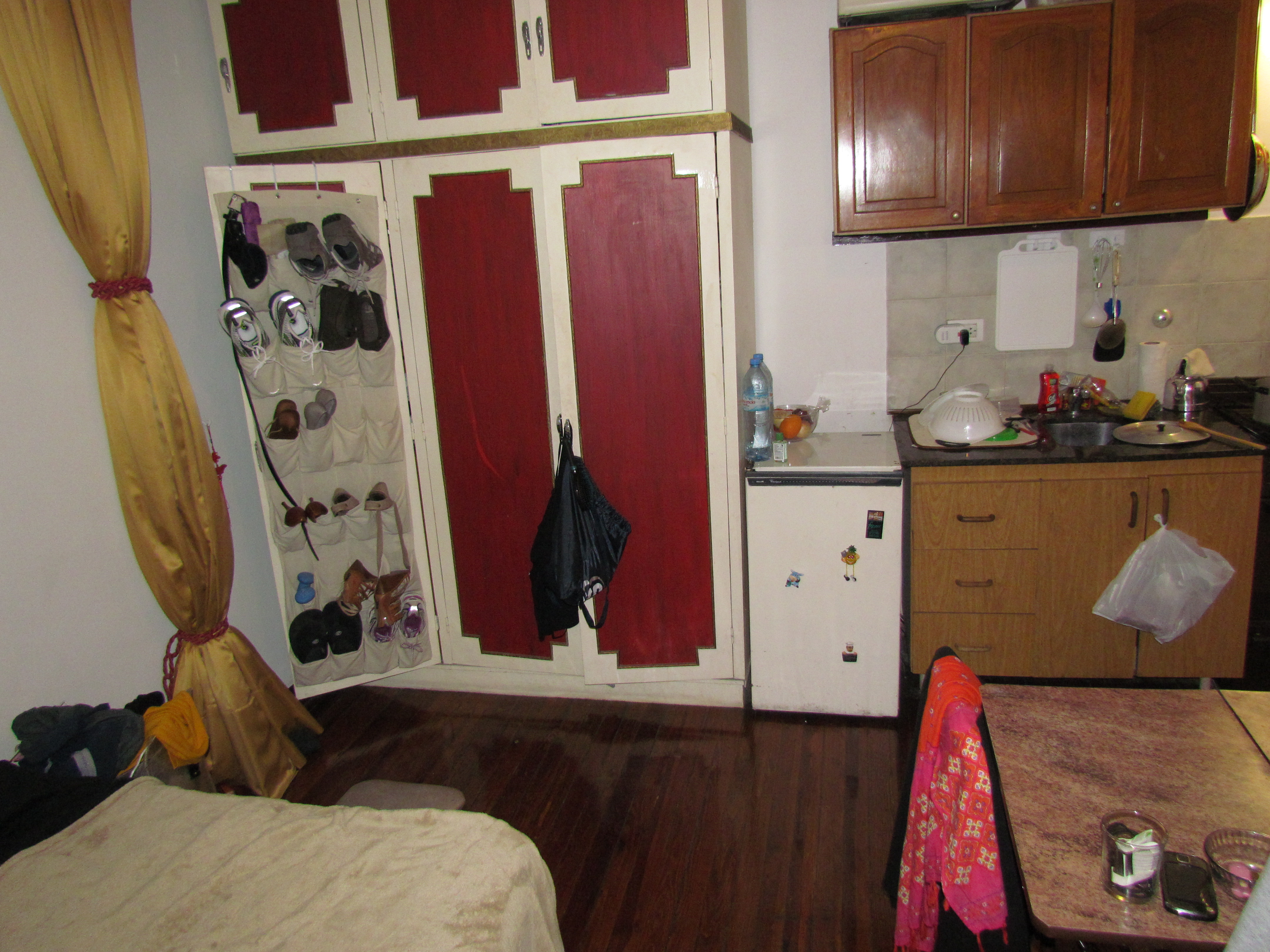 View of the wardrobe closet and kitchen from the office.